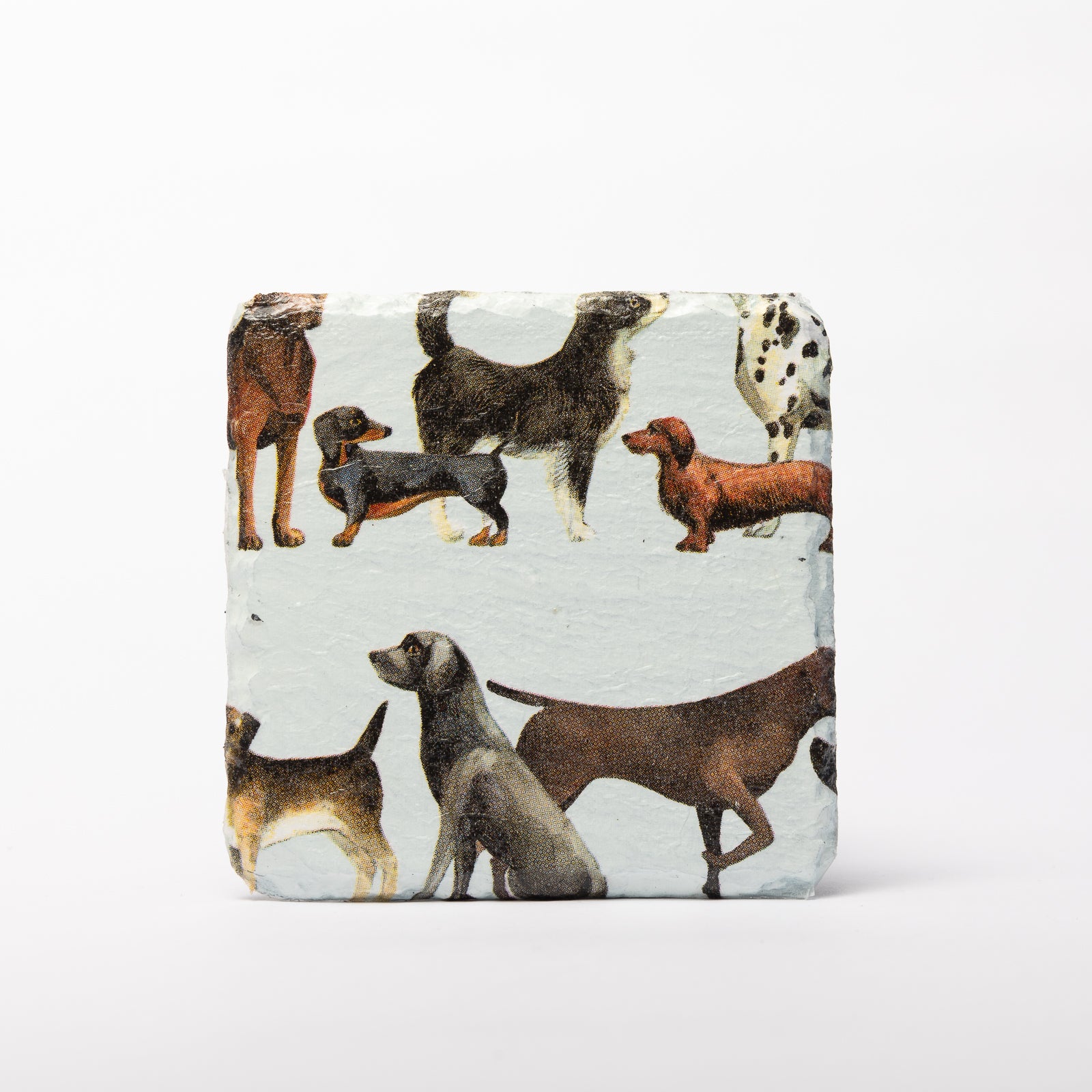 A pair of square slate coasters with a dog design. Clean with a damp cloth only. 10cm x 10cm