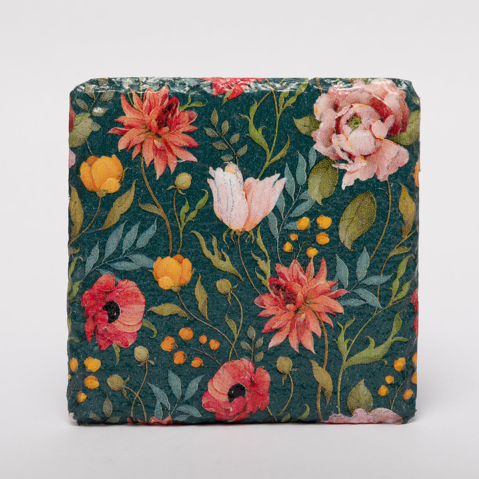 A pair of square slate coasters with a floral design. Clean with a damp cloth only. 10cmx10cm