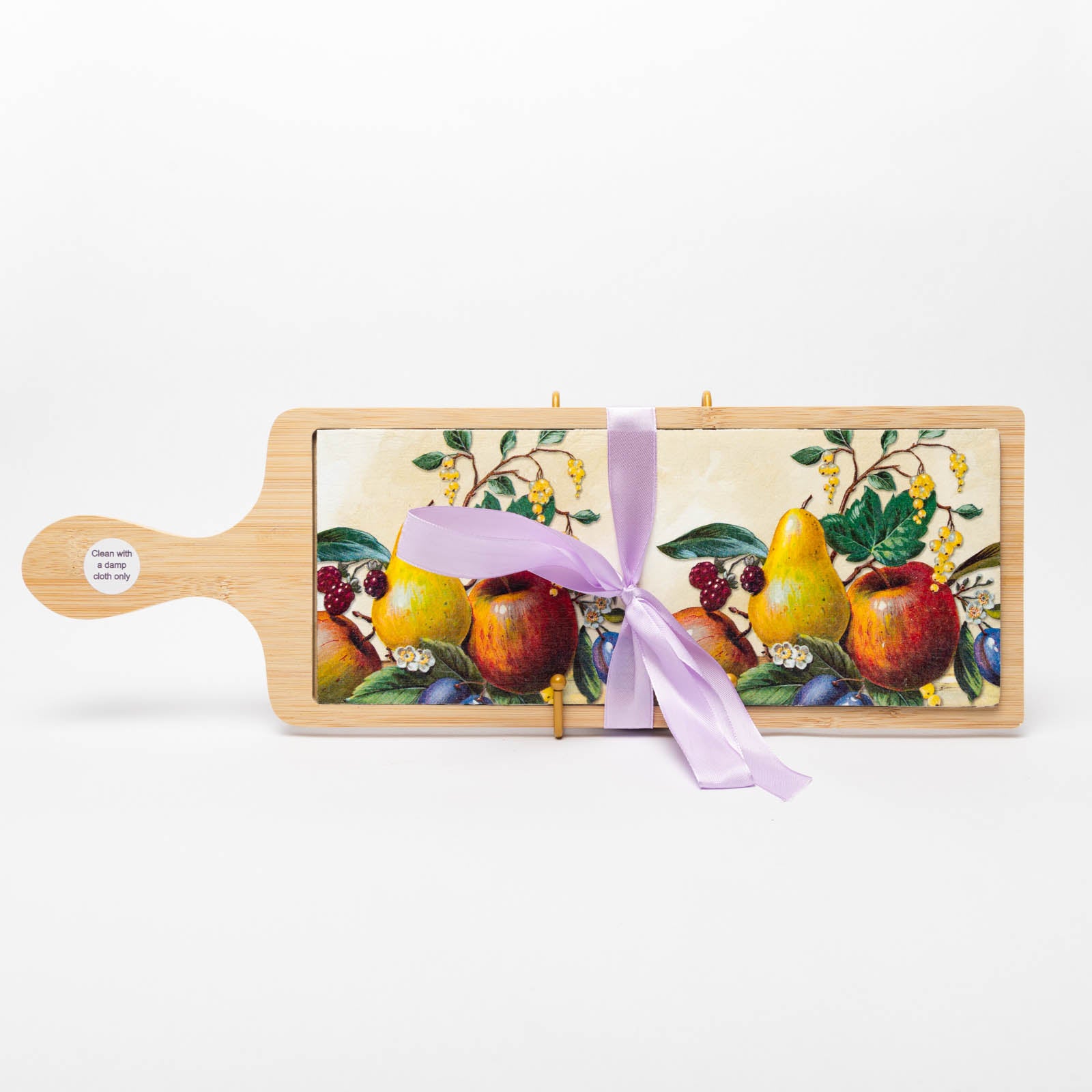 Wooden and slate serving board with a food safe decoupage fruit design tied with a removable decretive bow. 44cm x 15cm. Clean with a damp cloth only.
