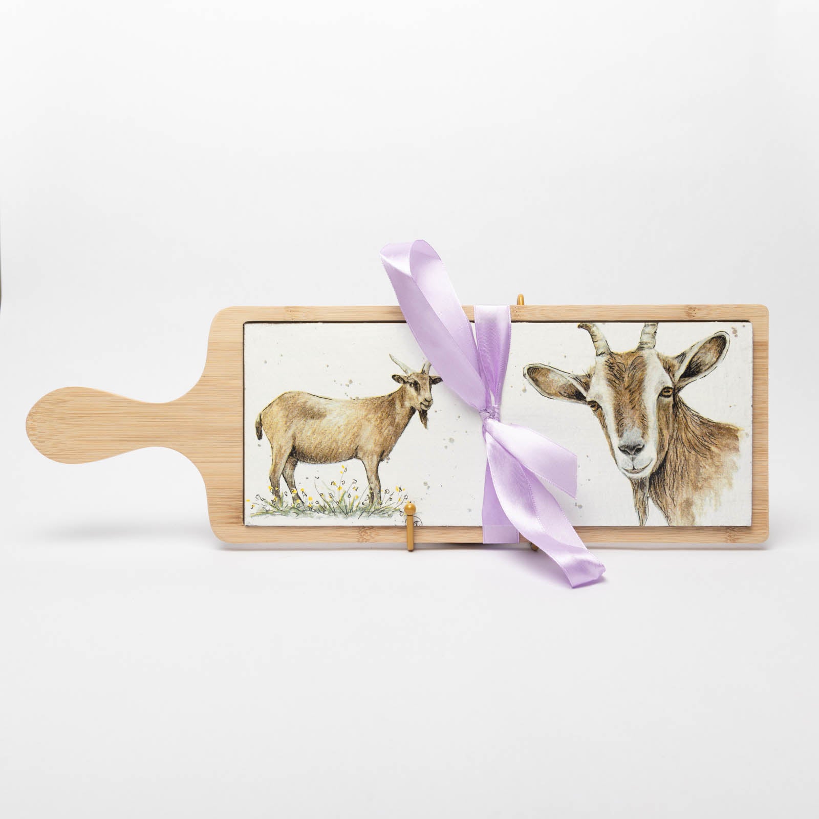 Wooden and slate serving board with a food safe decoupage goat design tied with a removable decretive bow. 44cm x 15cm. Clean with a damp cloth only.