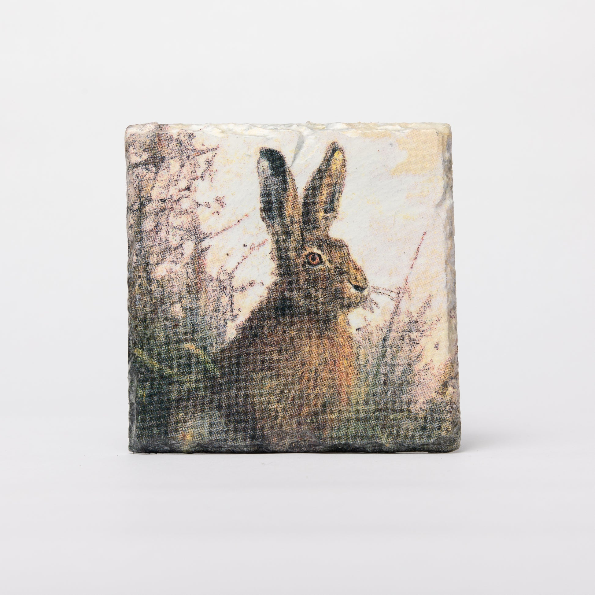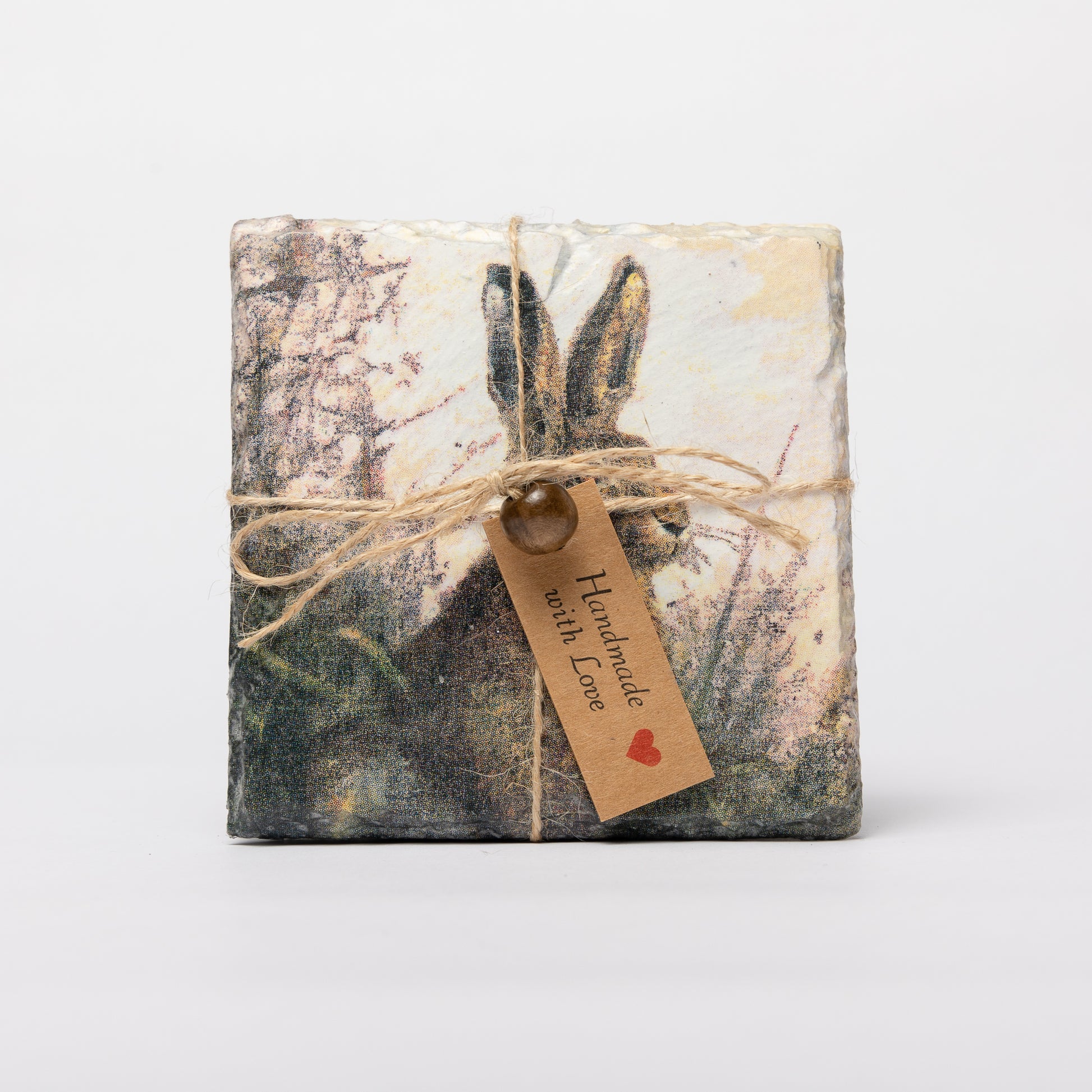 A pair of square slate coasters with a hare design. Clean with a damp cloth only. Size: 10cm x 10cm
