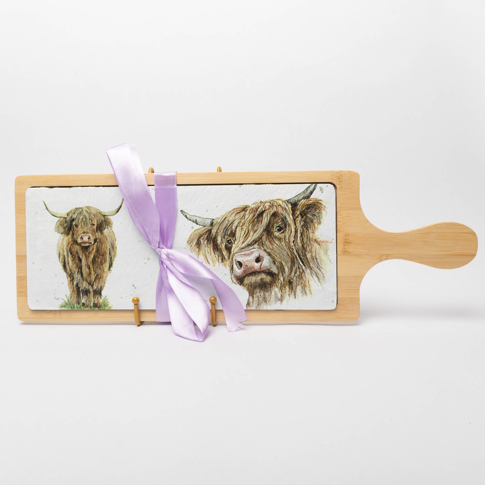 Wooden and slate serving board with a food safe decoupage highland cow design tied with a removable decretive bow. 44cm x 15cm. Clean with a damp cloth only.