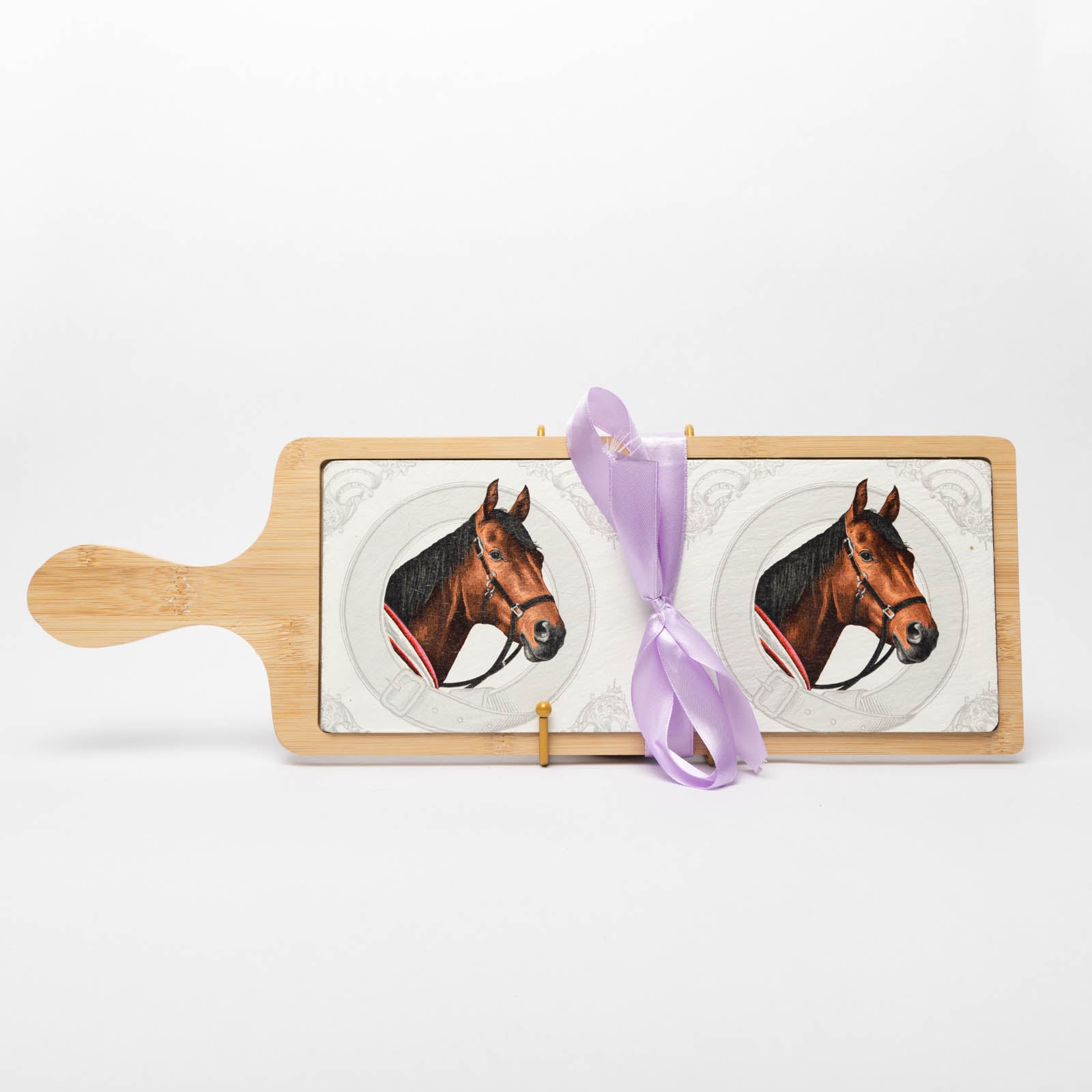 Wooden and slate serving board with a food safe decoupage horse design tied with a removable decretive bow. 44cm x 15cm. Clean with a damp cloth only.