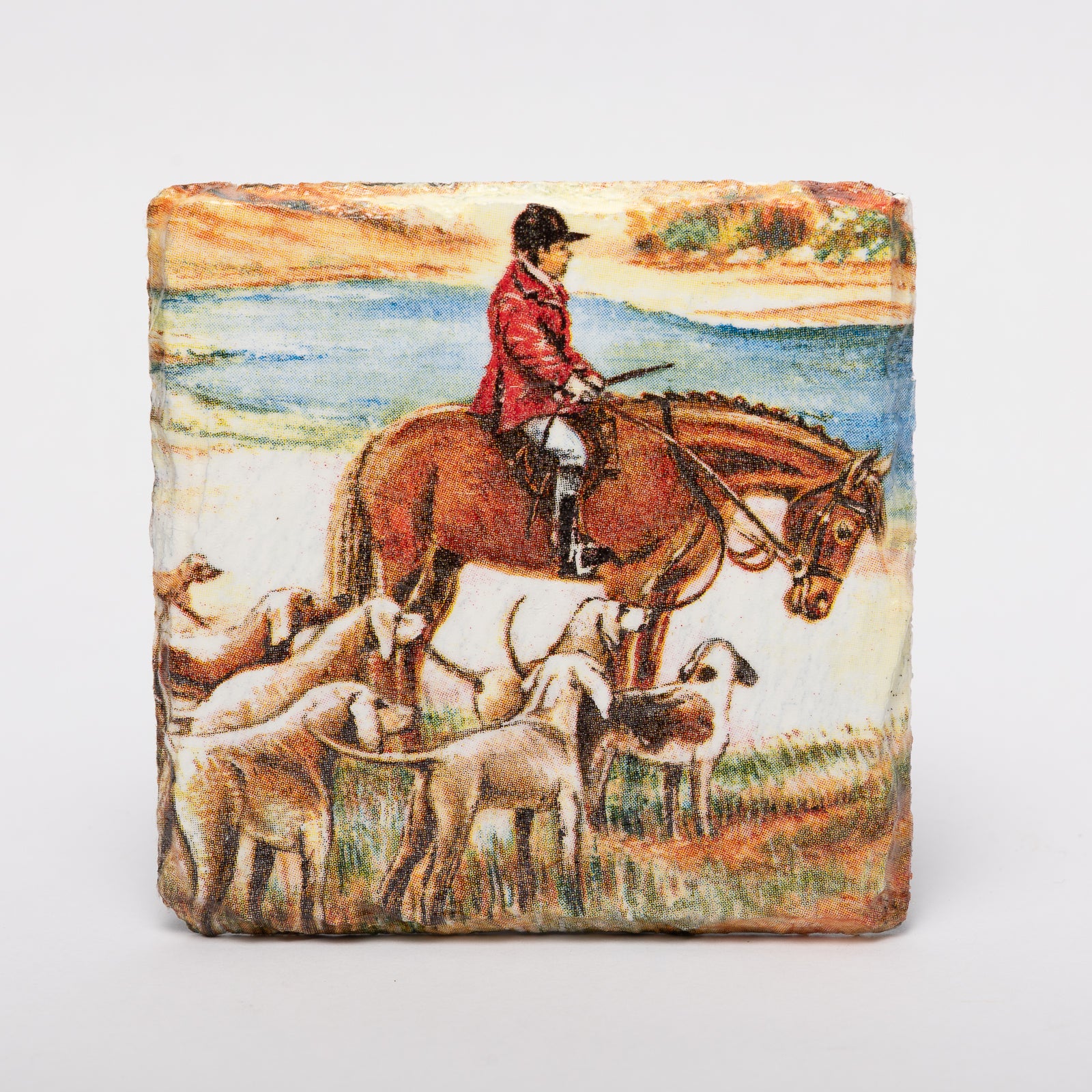 A pair of square slate coasters with a hunting theme design. Clean with a damp cloth only. 10cmx10cm