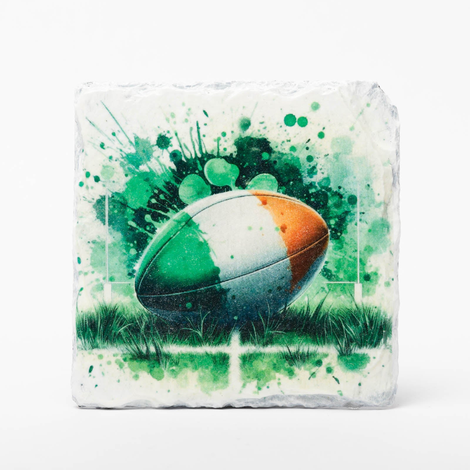 A pair of square slate coasters with an Irish Rugby design. Clean with a damp cloth only. 10cmx10cm
