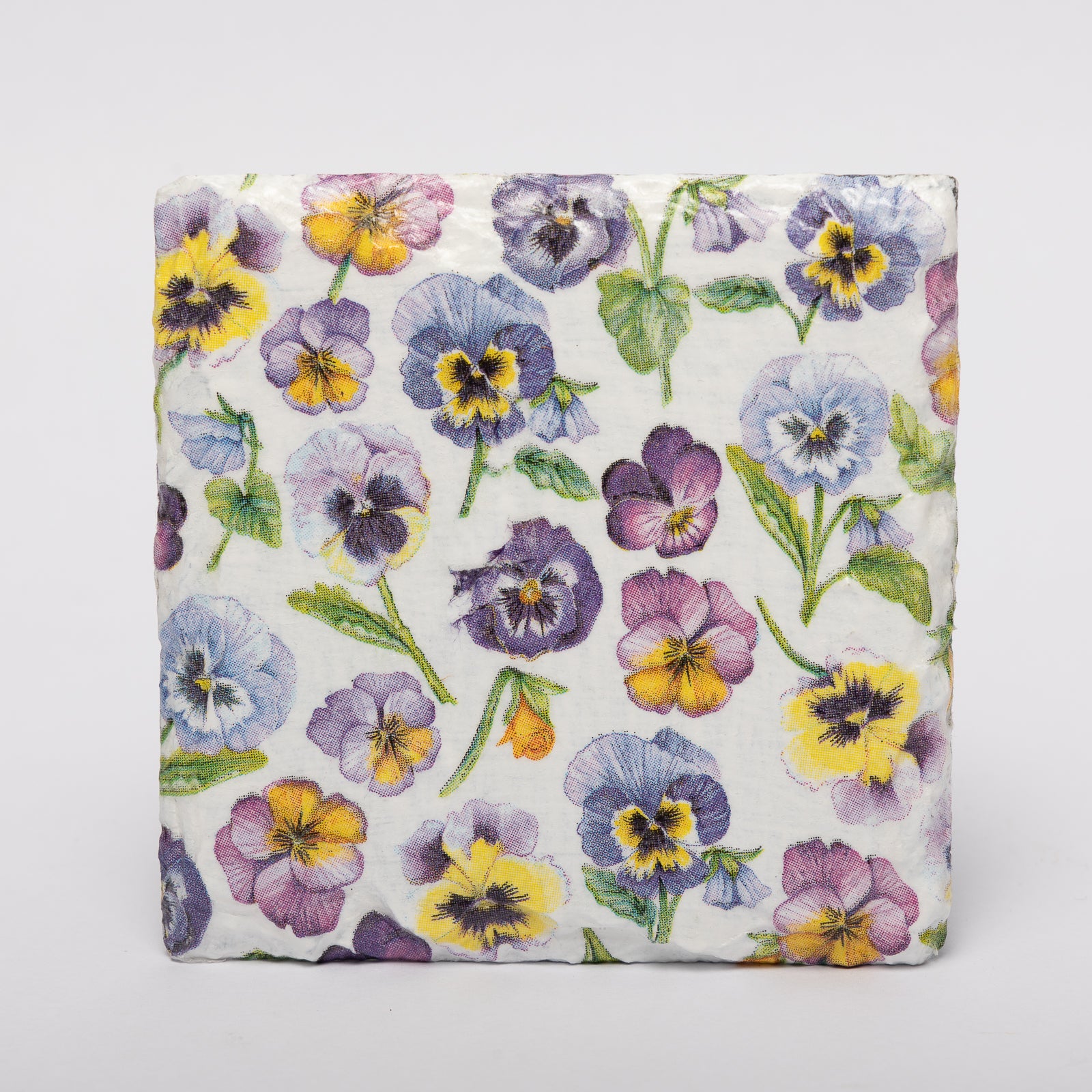 A pair of square slate coasters with a pansy design. Clean with a damp cloth only. 10cmx10cm
