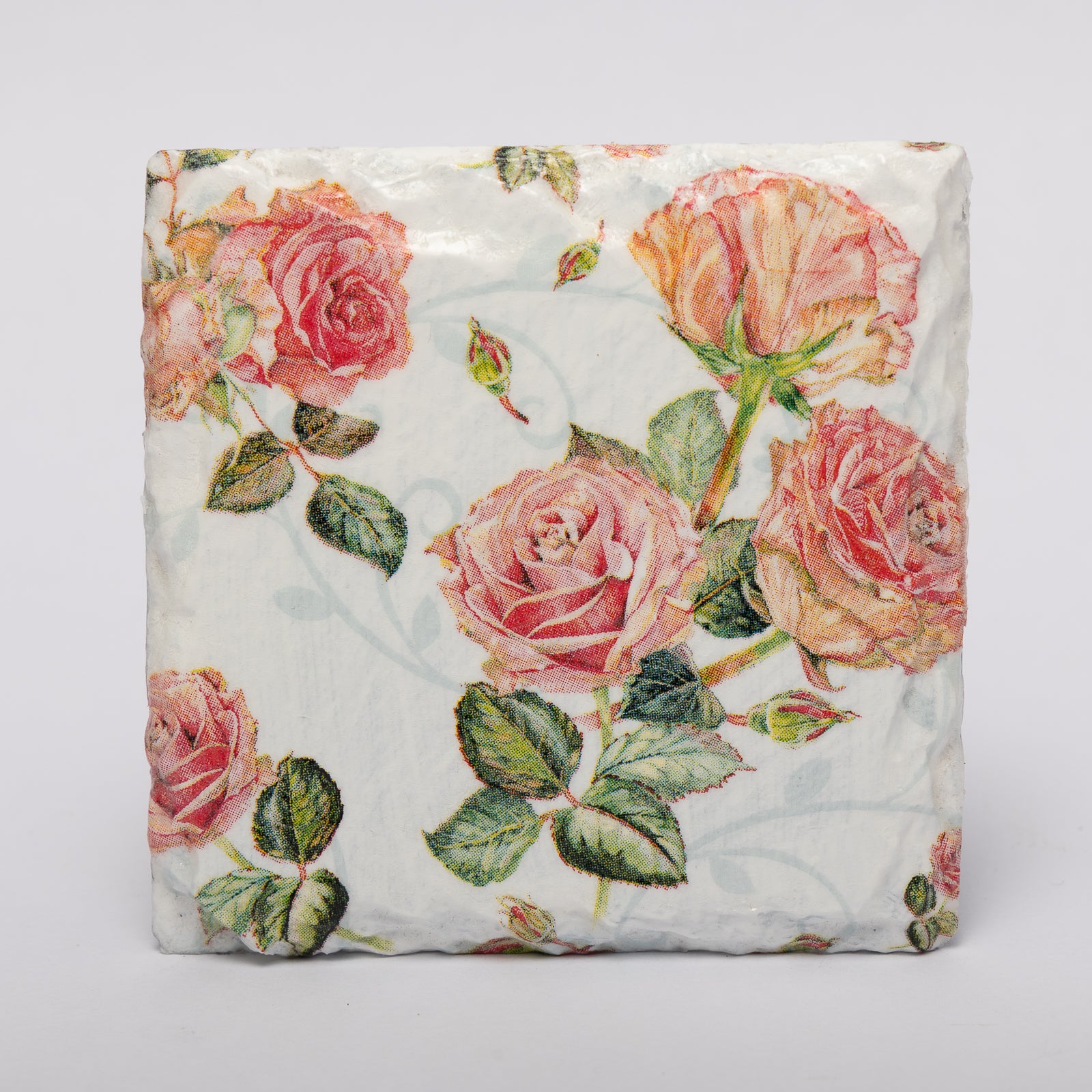 A pair of square slate coasters with a rose flower design. Clean with a damp cloth only. 10cmx10cm